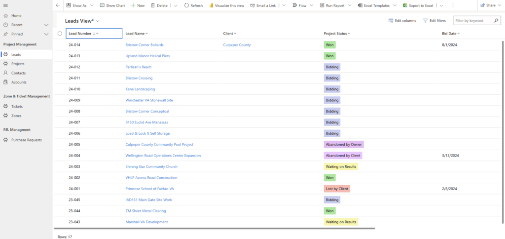 This Project Management application, built in Power Apps (model-driven), was designed to work alongside the Purchasing Order Application. Each project stores related records including cost codes, vendors, contacts, purchase order line items, equipment, employees, and tickets. Updates made in the Purchasing Order App synced in real time with project data. Cost codes are sourced through custom connectors from Heavy Job for accurate, up-to-date financial tracking. Vendor-related data such as expense accounts are also stored and automatically updated within the invoice line items.