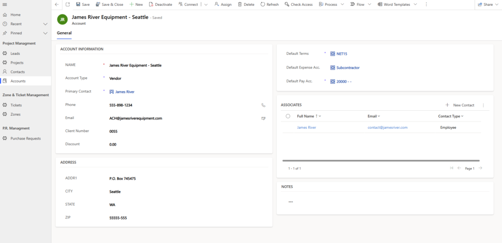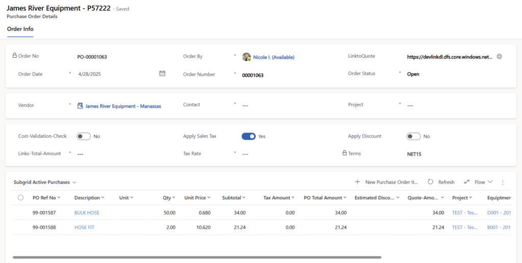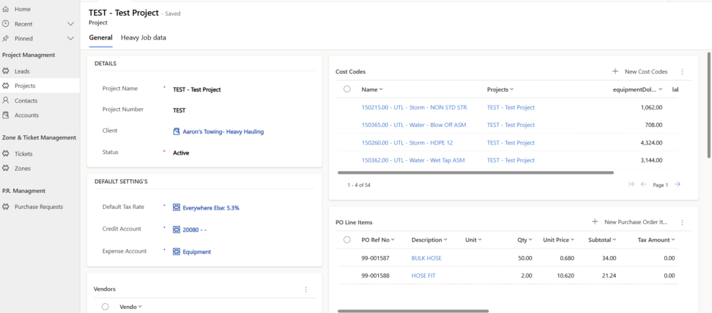 This Project Management application, built in Power Apps (model-driven), was designed to work alongside the Purchasing Order Application. Each project stores related records including cost codes, vendors, contacts, purchase order line items, equipment, employees, and tickets. Updates made in the Purchasing Order App synced in real time with project data. Cost codes are sourced through custom connectors from Heavy Job for accurate, up-to-date financial tracking. Vendor-related data such as expense accounts are also stored and automatically updated within the invoice line items.