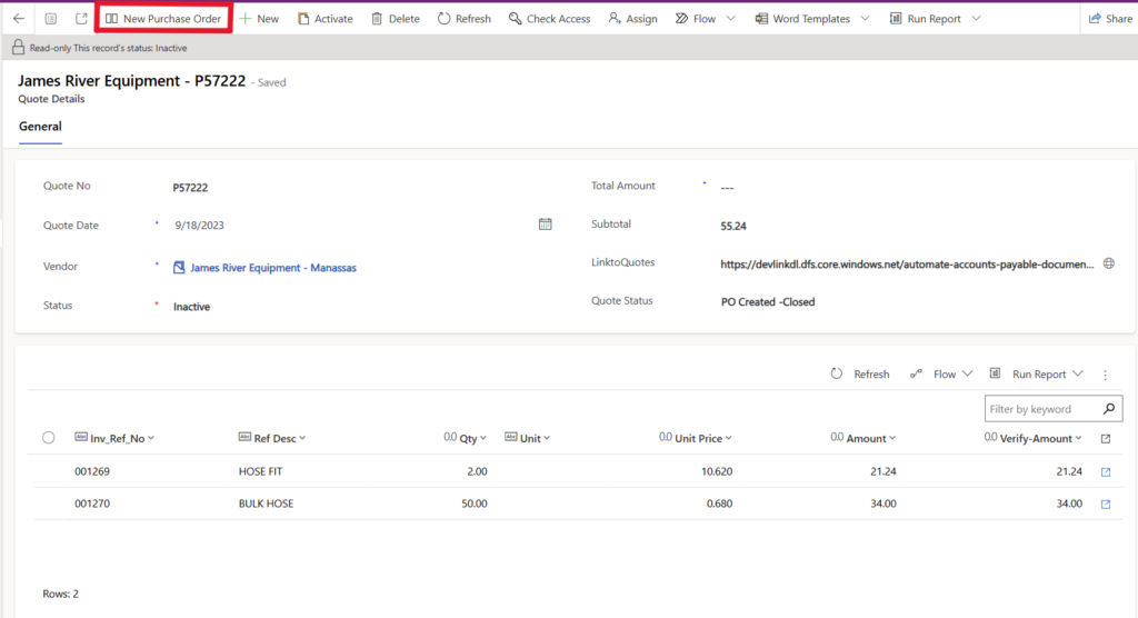 Quote Page – Custom Command to Create Purchase Order